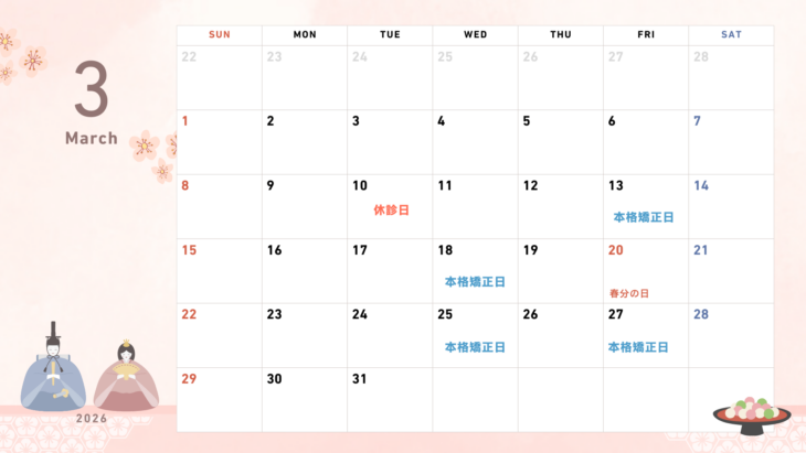 ・3/13(金)、3/18(水)、3/25(金)、3/27(水) 14時15分〜19時00分 ※矯正相談も矯正日に受け付けております。
